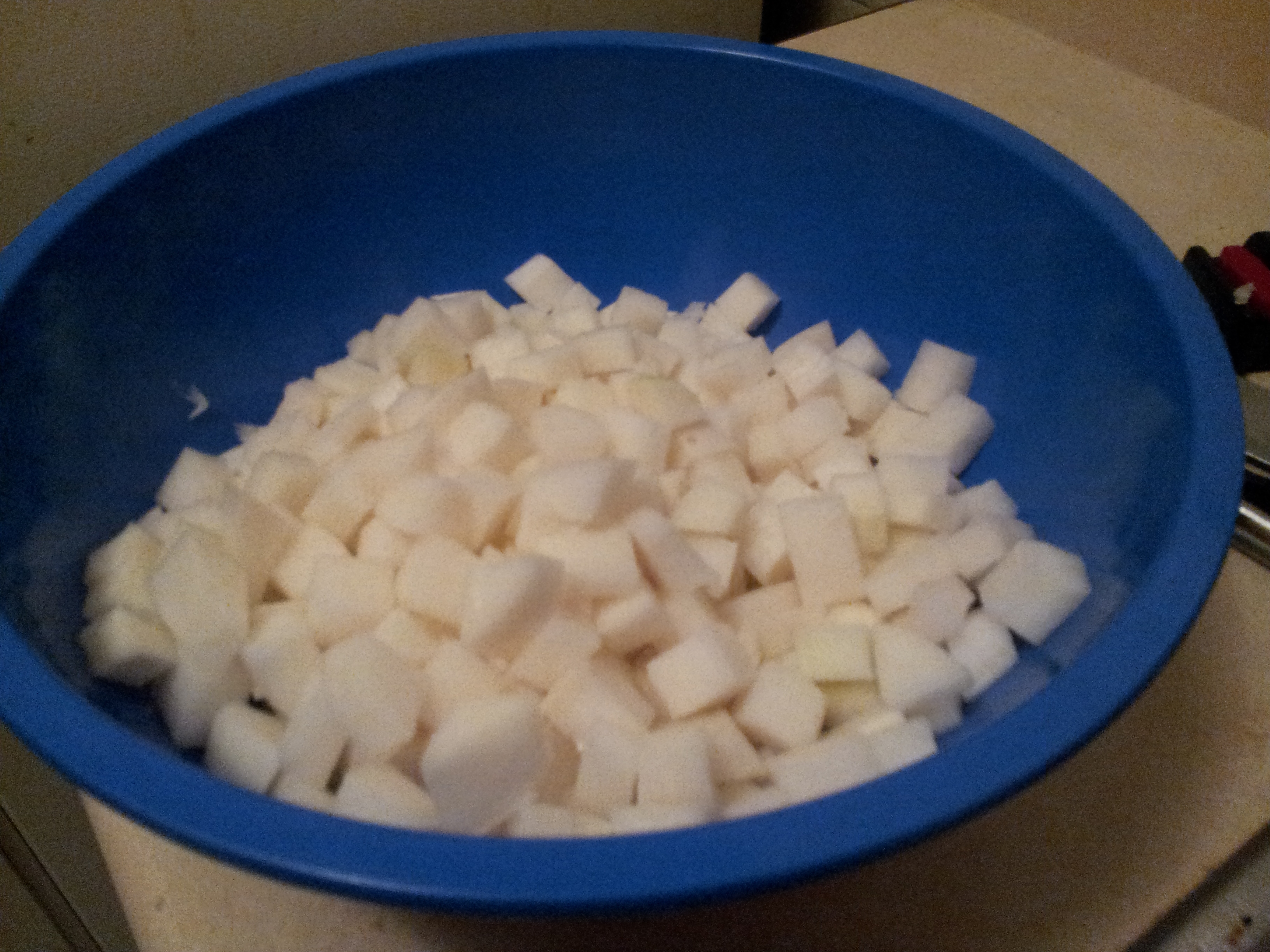 As it turns out, making kimchi? Totally kinda fun and easy. All I had to do was peel and cube the radish, then let it hang out in a mixture of salt and sugar for about 30 minutes.