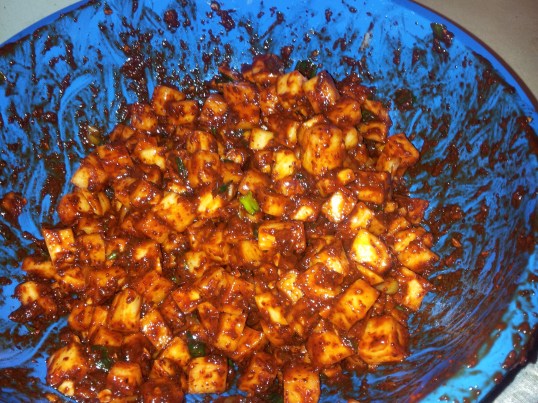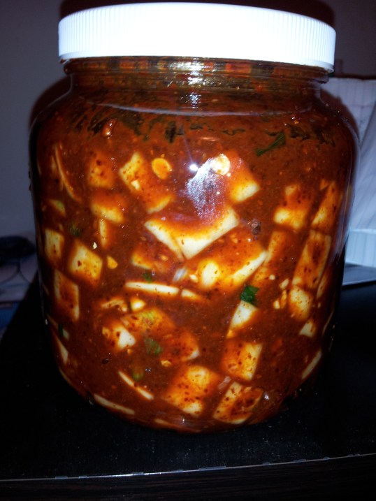 Moving on, now is time to add in the remainder of your ingredients: fish sauce (I HATE fish sauce, but it is infinitely useful), minced garlic, ginger, the radish juice, chopped green onions, and a rather healthy amount of red pepper flakes. Mix it all together with you hands and VOILA!