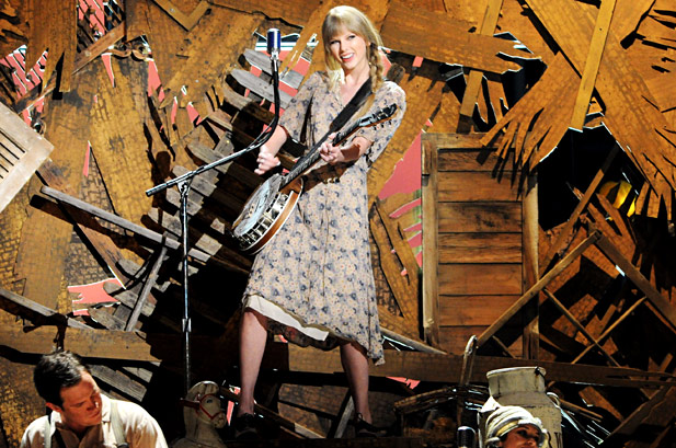 Taylor is dressed like she’s gonna go turn some letters for Pat Sajak after the show.