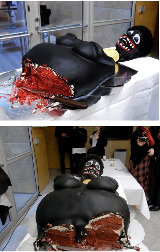 This cake was part of a “installation” at the Modern Art museum in Stockholm. The supposed purpose of the piece is to highlight the plight of female circumcision. The woman cutting the cake is Lena Adelsohn Liljeroth, the Minister of Culture and sports in Sweden. The artist is Makode Aj Linde, and in a special added bonus, thats his head at the top of the cake. Not a model of his head. THATS HIM.